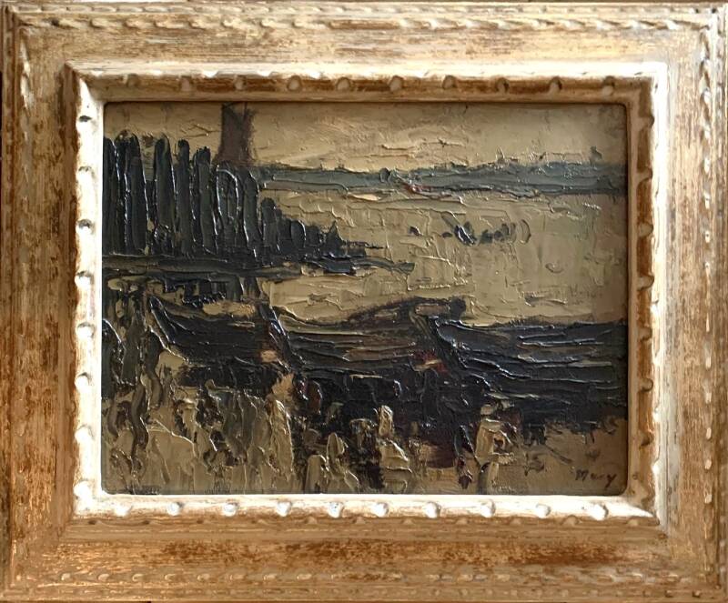 Een expressief geschilderd plasgezicht van Frans Albert Mooy (1884 – 1968). Olieverf op paneel; formaat 30 x 23 cm excl. lijst. Gesigneerd r.o. ‘Mooy’. Frans Mooy heeft gewerkt en gewoond in Haarlem, Heelsum en Laren. Hij heeft aan de Akademie voor Beeldende Kunst les gehad van o.a. W.B. Tholen. Frans Mooy was lid van Pictura Veluvensis in Renkum, de in 1902 door Theophile de Bock opgerichte vereniging van kunstschilders. Hij schilderde landschappen, plasgezichten en stadsgezichten in impressionistische stijl in navolging van de Haagse School.