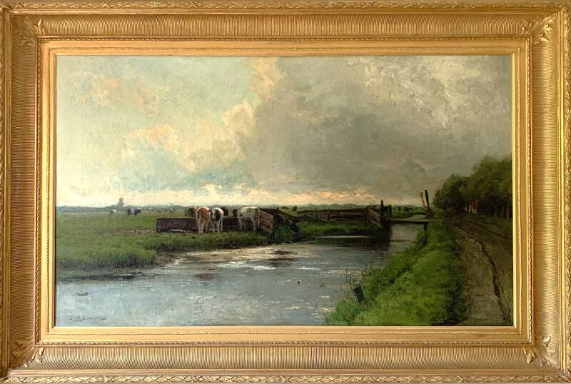 in de sobere stijl die Van Eijsden kenmerkt. Gesigneerd l.o. “T v Eijsden” Olieverf board. Formaat 30,5 x 64,5 excl. lijst. 61 xx 95 incl. lijst.