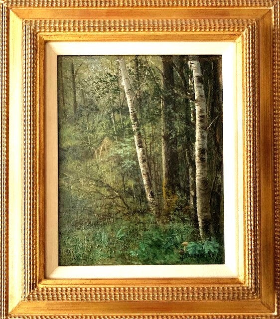 Een fijn geschilderd bosgezicht, waarin je de geuren van bos en mos als het ware kunt ruiken. Gesigneerd r.o. “J. Beauduin ‘83”. Olieverf op paneel; formaat 20 x 26 cm. Beauduin is een Belgische schilder die zijn opleiding heeft genoten aan de Koninklijke Academie voor Schone Kunsten in Antwerpen. Schilderde landschappen en portretten en exposeerde op de Salon in Parijs. Hij was ook illustrator van meerdere tijdschriften.